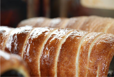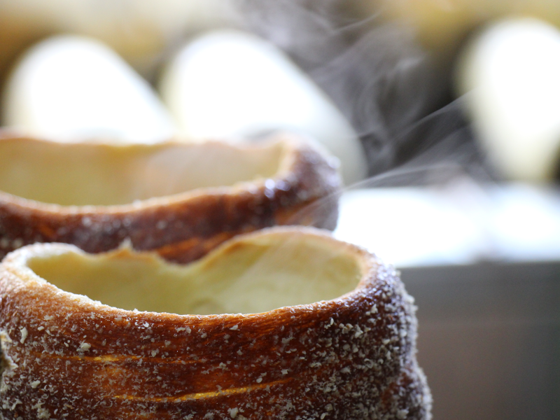 process the sugar stuck on kürtőskalács becomes caramel and forms shiny, crispy crust